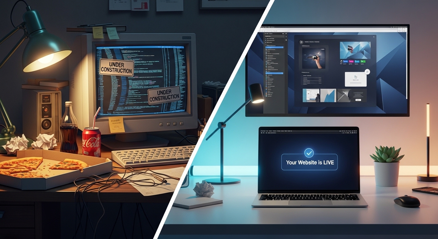 Bir ajans veya freelancer ile çalışırken sadece tasarıma para ödemezsiniz. Bekleme süreleri, revizeler için geçen günler ve "sunucu çöktü", "güncelleme sonrası site bozuldu" gibi teknik sorunlar işletmenize zaman kaybettirir. Geleneksel yöntemlerde süreç genellikle 4-8 hafta sürer.